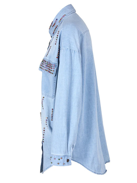 Multi Color Rhinestones Spliced Blouse For Women Lapel Long Sleeve Loose Shirt Autumn Vintage Fashion Clothing