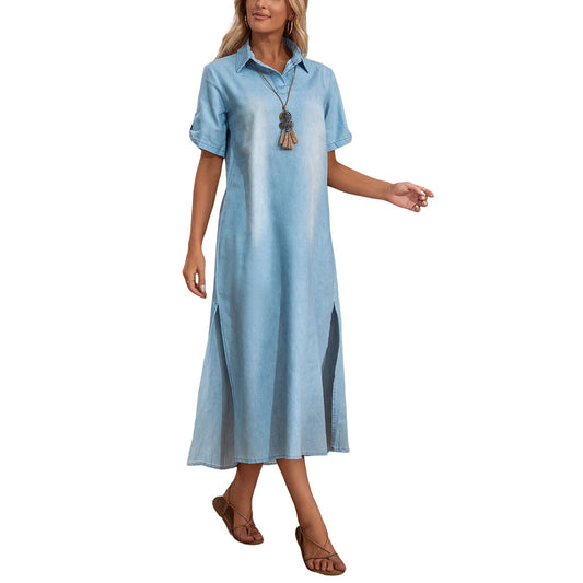 Casual Women Loose Dress Lapel Vintage Summer Side Slitting Hem Loose Long Denim Dress