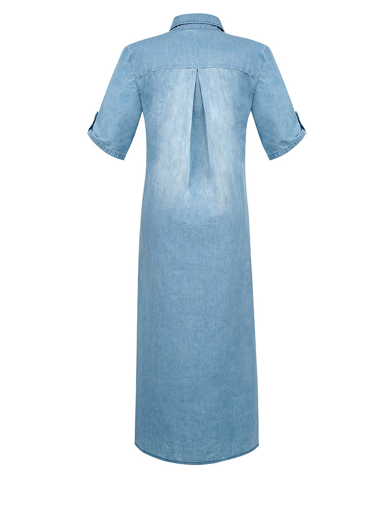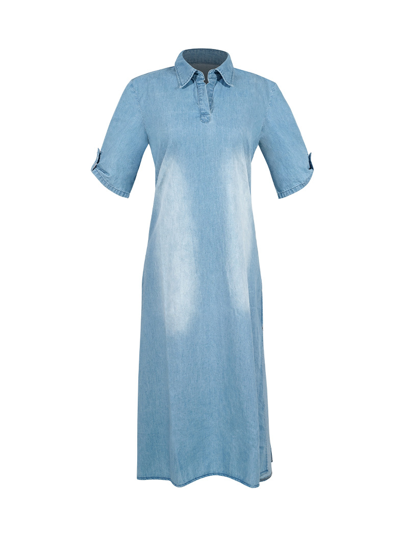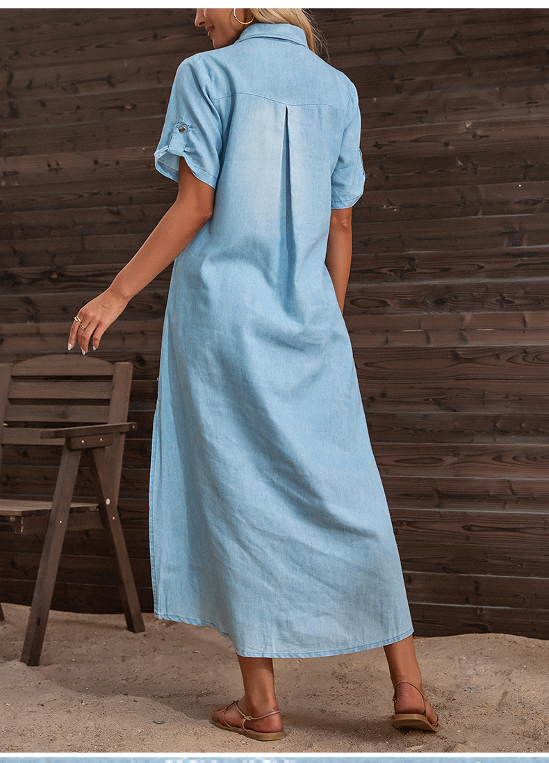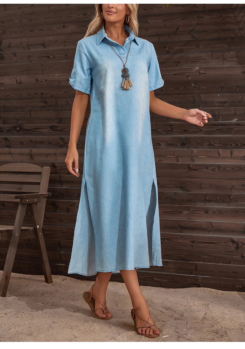 Casual Women Loose Dress Lapel Vintage Summer Side Slitting Hem Loose Long Denim Dress